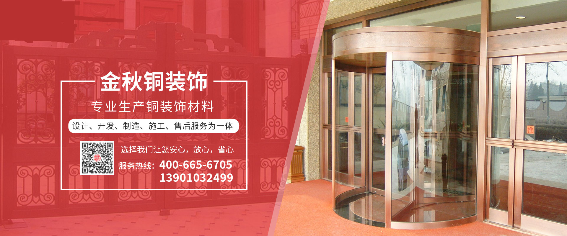 北京金秋銅裝飾材料有限公司是專業(yè)生產(chǎn)銅裝飾材料及設計、開發(fā)、制造、施工、售后服務為一體的大型綜合企業(yè)??沙薪咏ㄖ~裝飾工程及五星級酒店、別墅、博物館、樓樘管所等高檔銅裝飾項目;生產(chǎn)各種規(guī)格的旋轉(zhuǎn)門、平滑門、別墅門、電控門、工藝門、旋轉(zhuǎn)護欄、屋頂銅飾防水瓦、浮雕壁畫......